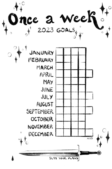 2023 Goals I made this template to keep track of my 2023 goal to skate at least once a week—and wanted to share for others who have a weekly goal or are trying to form a habit. Download it here as a printable 4x6 card, in green or black. Free for personal use.