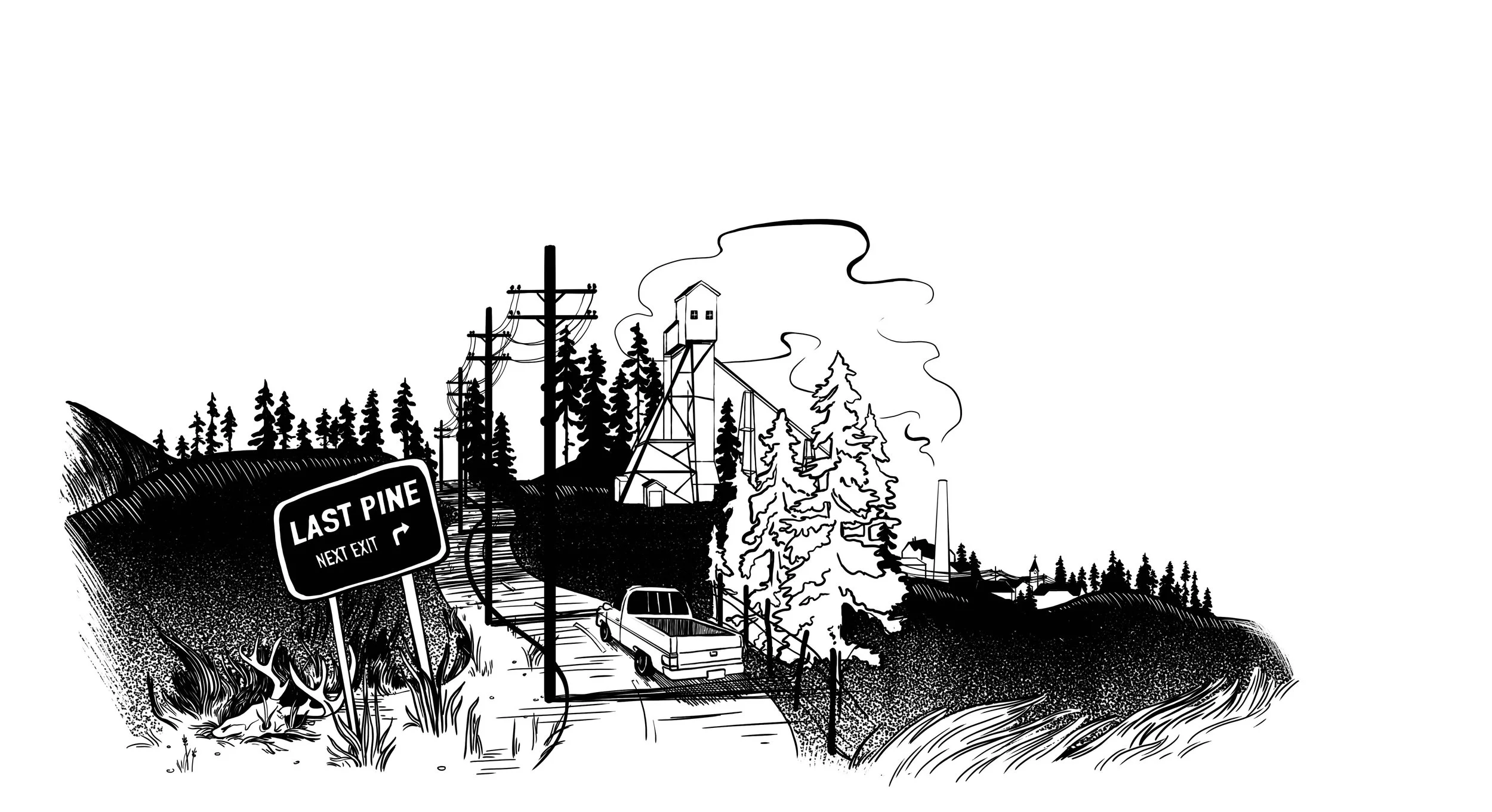 Welcome to Last Pine (2022), an illustration for Bump in the Dark, a Forged-in-the-Dark Monster-Hunting tabletop rpg by jex thomas.